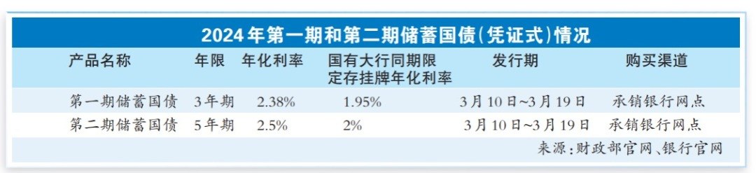 根据财政部官网消息,2024年第一期和第二期储蓄国债(凭证式)于3月10日至3月19日发售。本次国债最大发行总额为300亿元。其中,第一期期限为3年,票面年利率2.38%;第二期期限为5年,票面年利率2.5%。