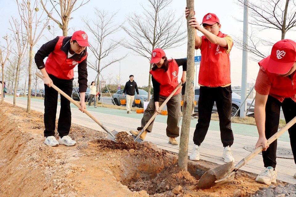 铲土、扶苗、填土、踩实、浇水……志愿者们热情饱满,干劲十足,植树现场一片热火朝天的忙碌景象。经过一下午的辛勤劳动,一棵棵新栽的洋紫荆树苗迎风挺立,初绽的枝叶在阳光下生机勃勃。“今天我们用心种下美好的希望,明天将收获一片广阔的人生风景,道路旁的紫荆花来年一定是这里独具一格的风景线,让‘绿美湾区’成为大家共同的愿景。”南沙区东涌镇建设办主任杨晓龙说。