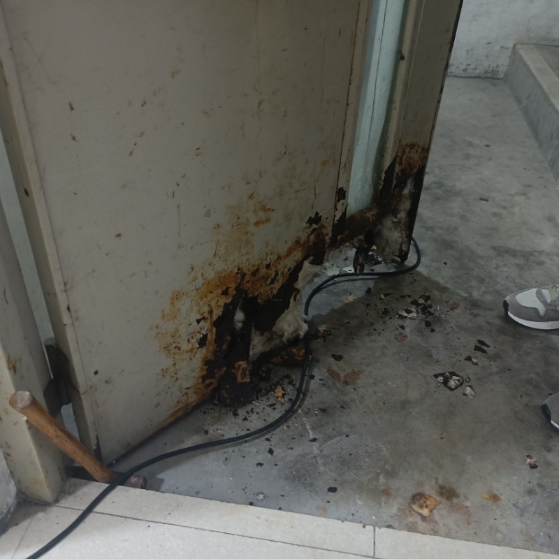 而在天河区都市华庭小区,消防监督员发现日彩轩的9、12、16楼的防火门竟然已经腐烂,防火门的铁皮可以用手指拧下,根本起不到防火作用。消防监督员当场立即要求物业必须对防火门进行修复完善,以便在紧急状态下,保护居民生命财产安全。