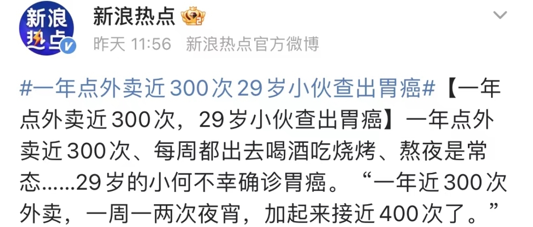 #一年点外卖近300次29岁小伙查出胃癌#