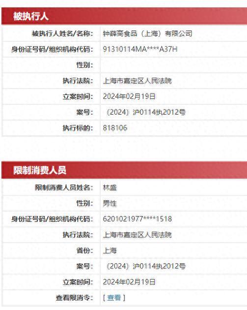近日,因未履行生效法律文书确定的给付义务,钟薛高食品(上海)有限公司及其法定代表人林盛被限制高消费,涉及仲裁案件,申请人为周某某、裴某某等,执行法院为上海市嘉定区人民法院。关联案件流程显示,此前,该公司已成被执行人,执行标的81.81万元。