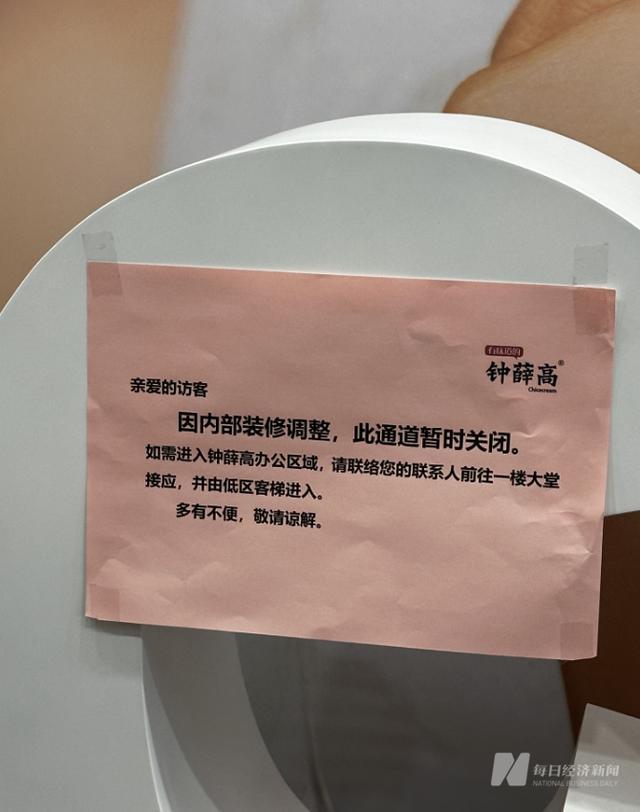 下午两时许,钟薛高总部正门被暂时关闭,门前被一块约3米长的宣传物料直接遮挡。宣传物料上贴有一张粉色纸张,钟薛高方面表示,通道关闭主要因“内部装修调整”。记者从一旁的小门向内观察发现,办公室内灯光如常,仍有人员走动,并无明显的装修施工痕迹。