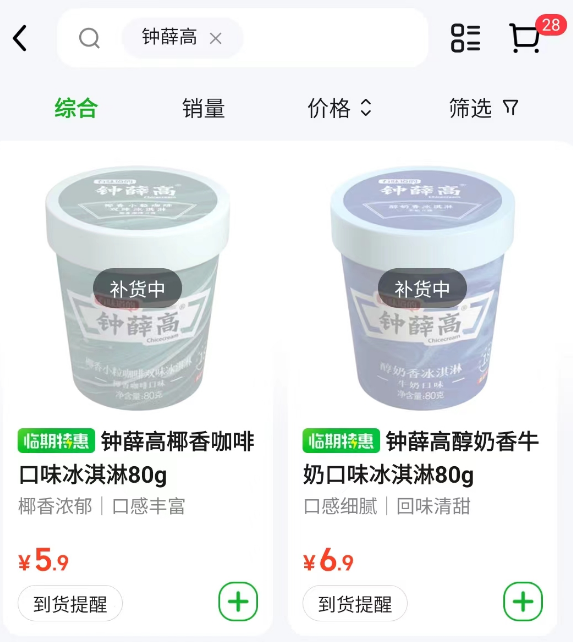 证券时报·e公司记者登陆美团小象超市看到,规格为80克的钟薛高椰香咖啡口味冰淇淋,为临期特惠产品,目前售价为5.9元,是原价18元的3折左右,但平台显示补货中。