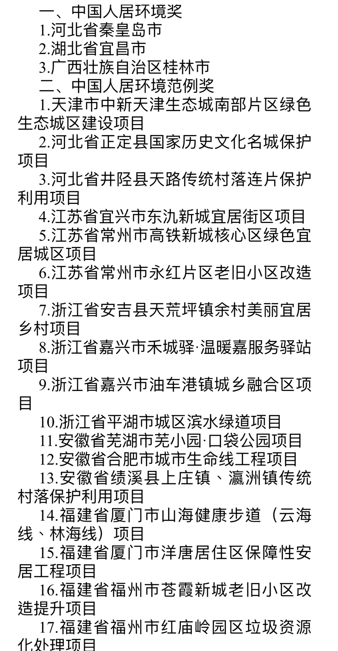 根据《住房和城乡建设部关于印发中国人居环境奖申报与评选管理办法的通知》,经各地申报、专家评审、实地调研、综合评议等程序,住建部决定授予河北省秦皇岛市、湖北省宜昌市、广西壮族自治区桂林市中国人居环境奖,授予天津市中新天津生态城南部片区绿色生态城区建设项目等36个项目中国人居环境范例奖。