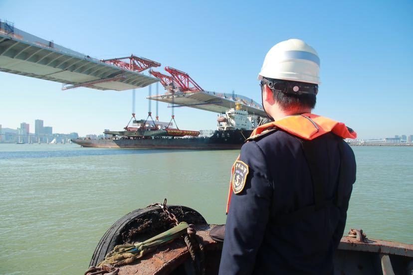 负责此次作业珠海方面现场管控的珠海湾仔海事处处长张锦汉告诉记者,吊装作业前,珠澳海事部门共同制定交通管制计划,提前发布航行警告,引导船舶合理安排航行计划,避开施工水域。12日,珠海海事局在外围珠海水域设置远程和现场警戒线,澳门海事及水务局在作业位置上下游设置警戒线,双方通过远程管控和现场执法船艇精准拦截的方式,对可能闯入警戒区影响作业安全的无关船舶进行了提醒拦截,全程保障了吊装作业的顺利进行。