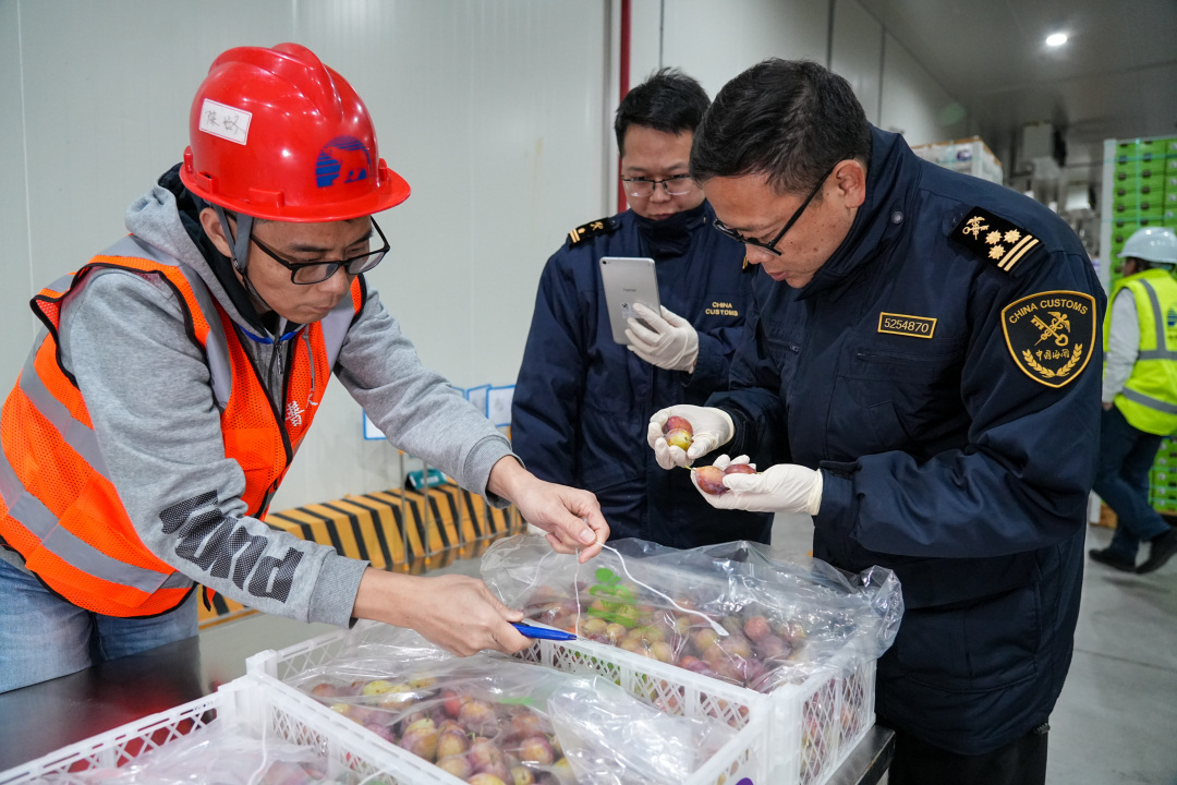 沙田海关关员在东莞港78号码头监管验放智利进口西梅