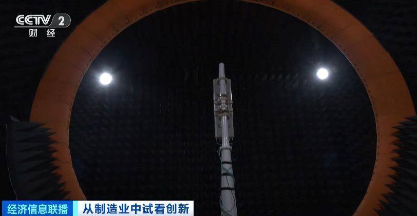 总台央视记者 宁坤:走进暗室房间之后,可以看到这样一个直径6米、最高处可以高达9米的橙色的大圆环。这样一个圆环,其实是一套专门用于测试5G基站天线性能的实验室装置。整个圆环一圈有128个小探头,随着圆环中心基站天线的旋转,这些探头就可以捕捉测试出天线在不同角度的发射性能。