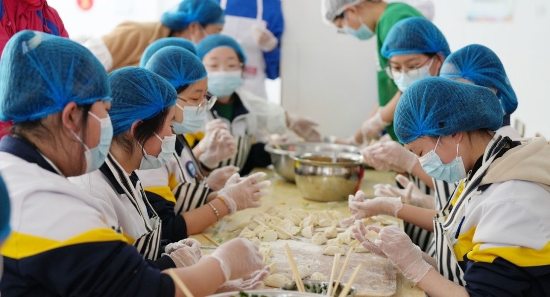 (龙泉关学校的孩子们与袁记云饺志愿者一起包饺子。)