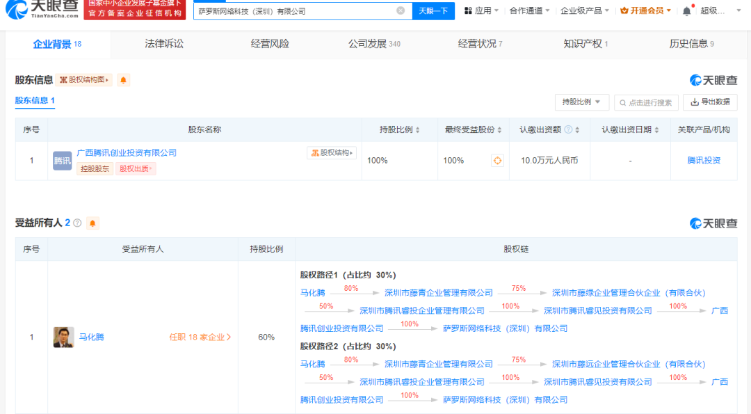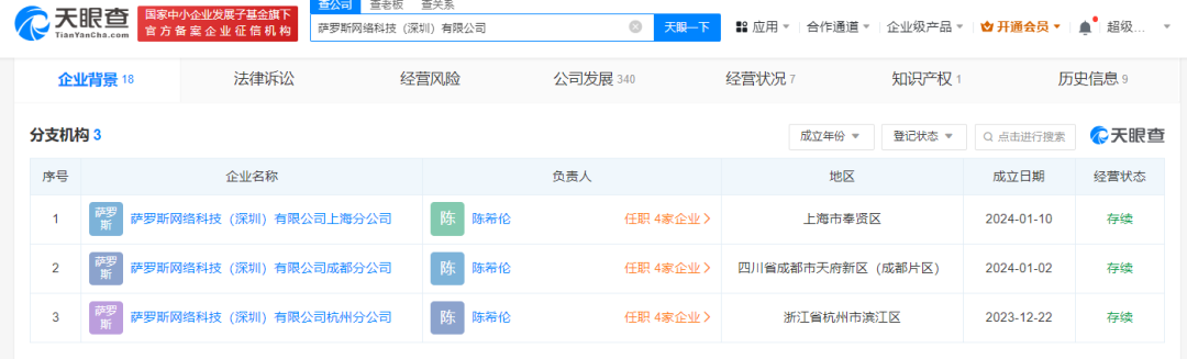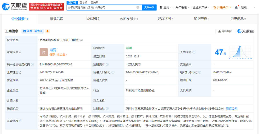 天眼查App显示,萨罗斯网络科技(深圳)有限公司成立于2023年12月,法定代表人为肖丽,注册资本10万元人民币,经营范围包括网络技术服务、动漫游戏开发、数字文化创意软件开发、数字内容制作服务等,股东信息显示,该公司由广西腾讯创业投资有限公司全资持股。分支机构信息显示,该公司已在上海、成都、杭州成立分公司,负责人均为陈希伦。