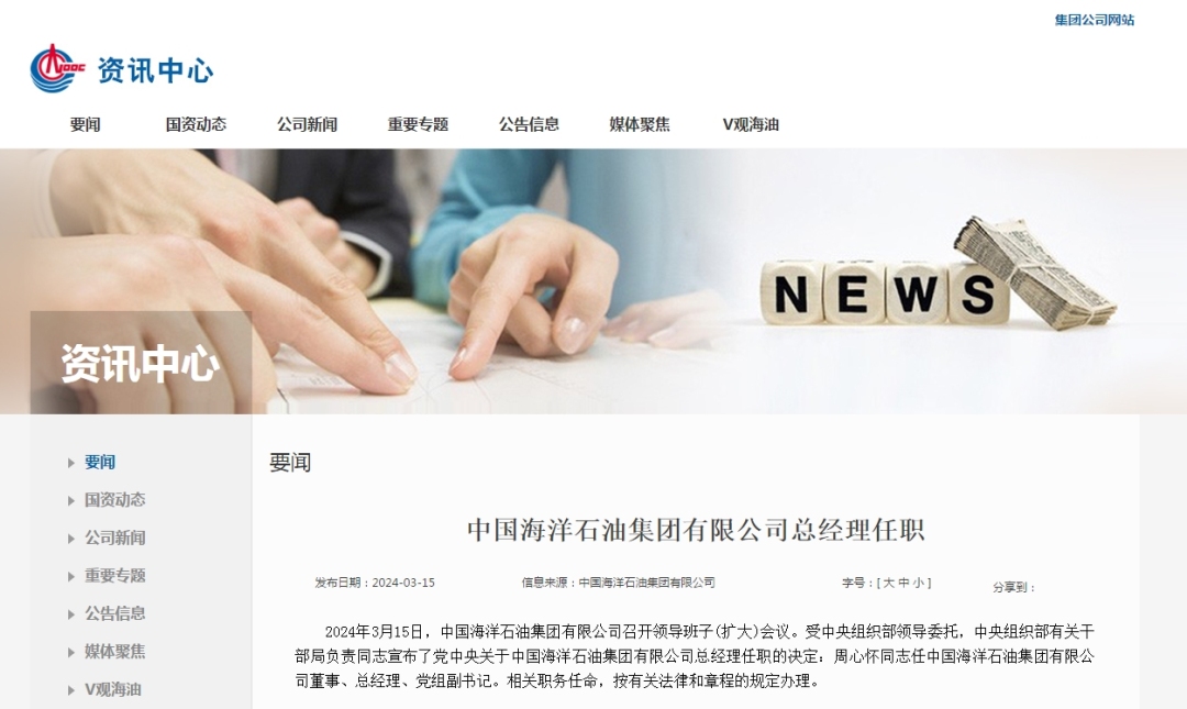 2024年3月15日,中国海洋石油集团有限公司召开领导班子(扩大)会议。受中央组织部领导委托,中央组织部有关干部局负责同志宣布了党中央关于中国海洋石油集团有限公司总经理任职的决定:周心怀同志任中国海洋石油集团有限公司董事、总经理、党组副书记。相关职务任命,按有关法律和章程的规定办理。