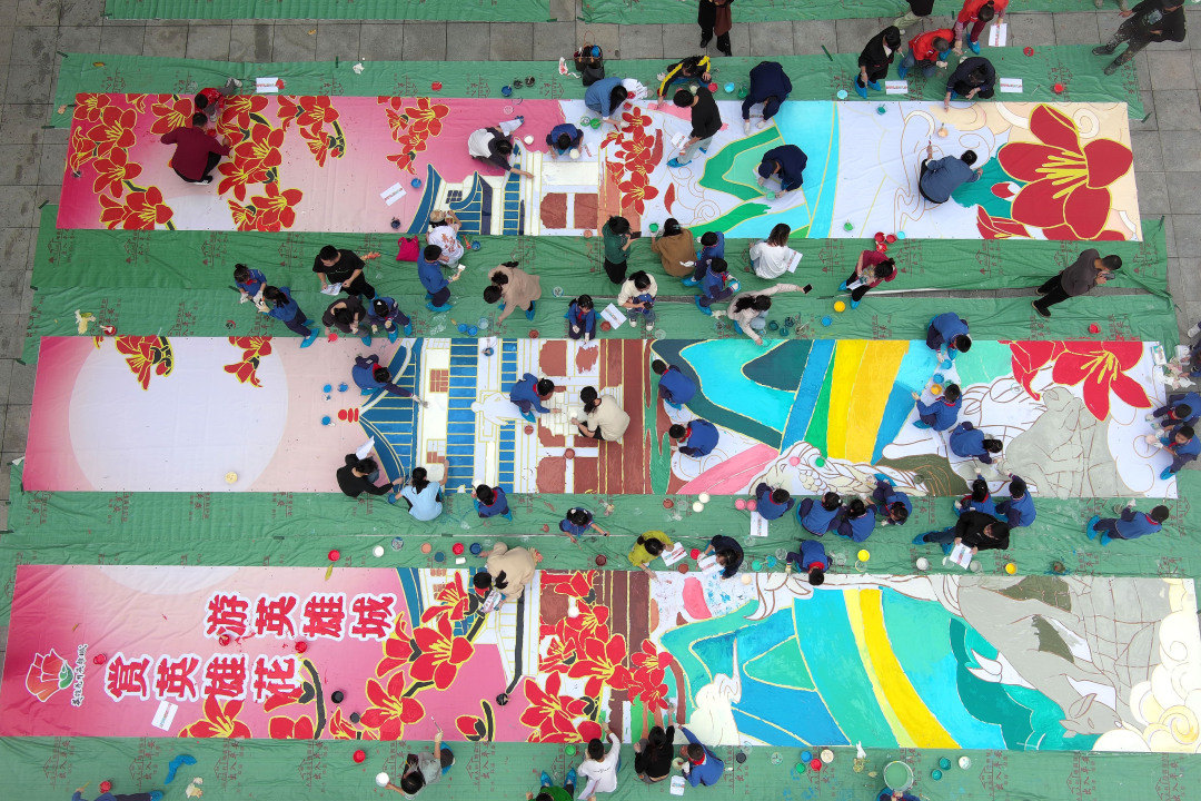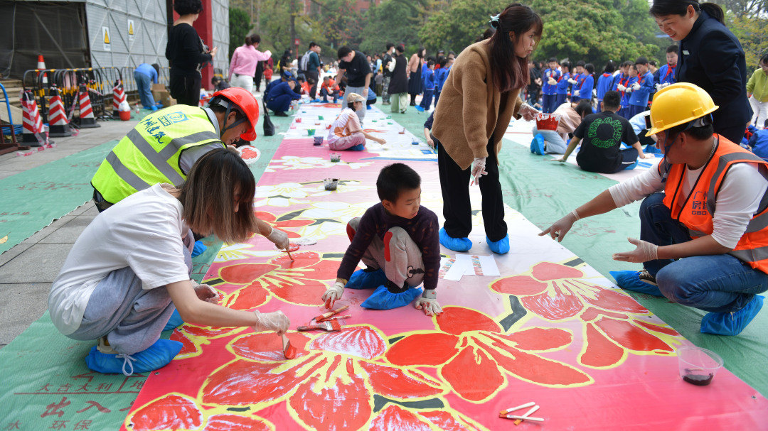 当天下午,在广州中山纪念堂东平台,一场别开生面的活动——“最美奋斗者同绘英雄花”引来无数游客驻足。来自全市的优秀共产党员、武警官兵、消防战士、公安民警、环卫工人、绿化工人、大学生志愿者、残障特殊人群及少先队员等100余人,共同在由仲恺农业工程学院何香凝艺术设计学院的党员师生们创作的两幅高14.4米、宽6米的巨型画作上,留下奋斗的印记。这幅壮丽的红棉长卷描绘了百名奋斗者,百种故事,百样人生。