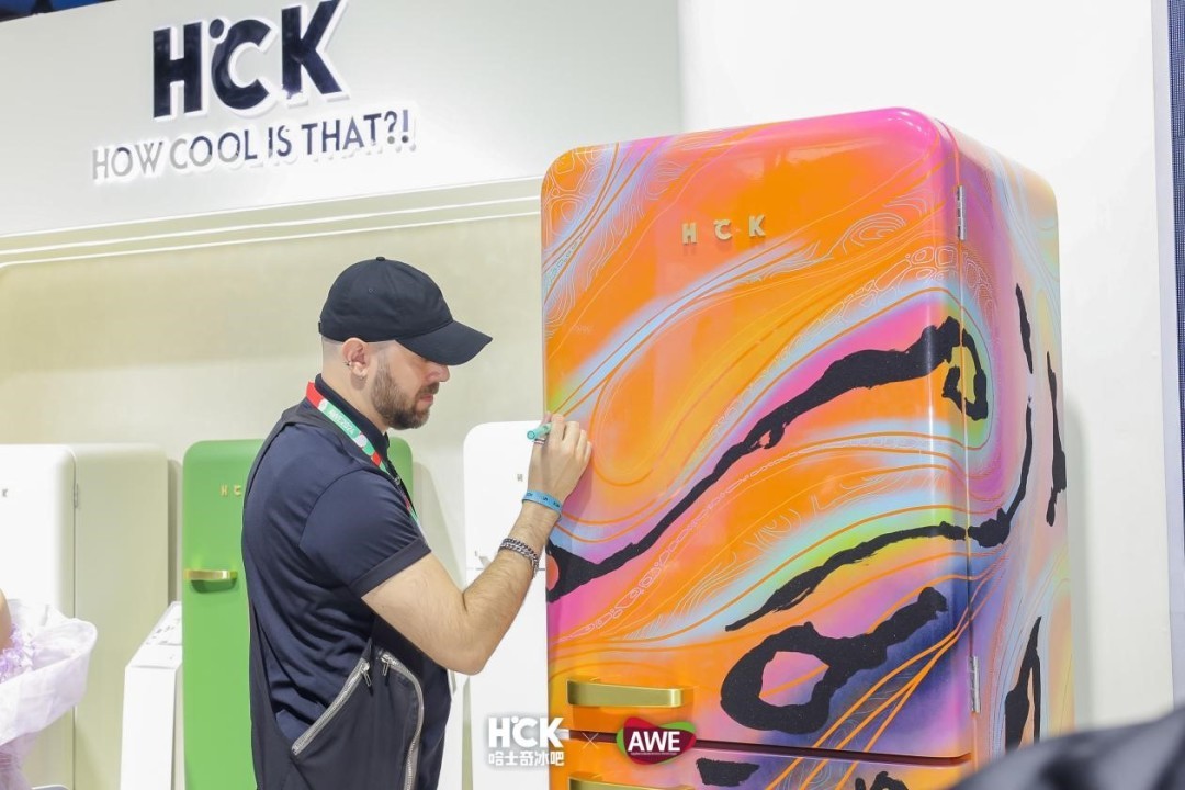 聚焦“冰吧”细分领域的是HCK哈士奇,今年企业展区延续了以往北欧简约舒适的调性,通过视觉让消费者对产品有“先入为主”的作用。值得一提的是,该品牌非常注重产品设计感,今年带来了一批视觉艺术家的联名款冰吧家电,主打时下流行的“小香风”。