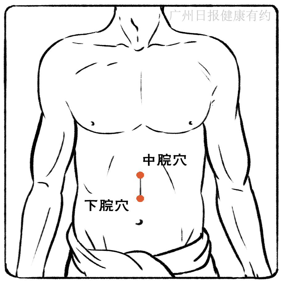 2.按摩中脘穴。作为身体的祛湿开关,中脘穴位于胸骨下端和肚脐连线的中点,一般在肚脐上4寸,具有和胃健脾、降逆利水的功能。每天晚上睡前躺在床上用指端或掌根在穴上顺时针揉2-5分钟,也可以用掌心或四指按摩2-10分钟。