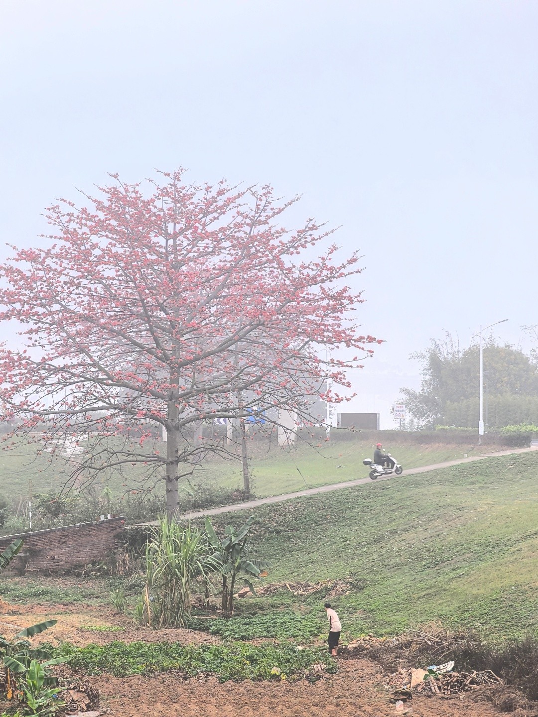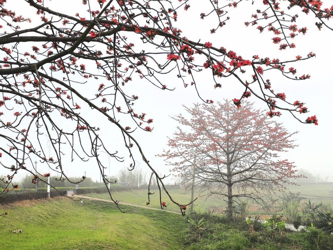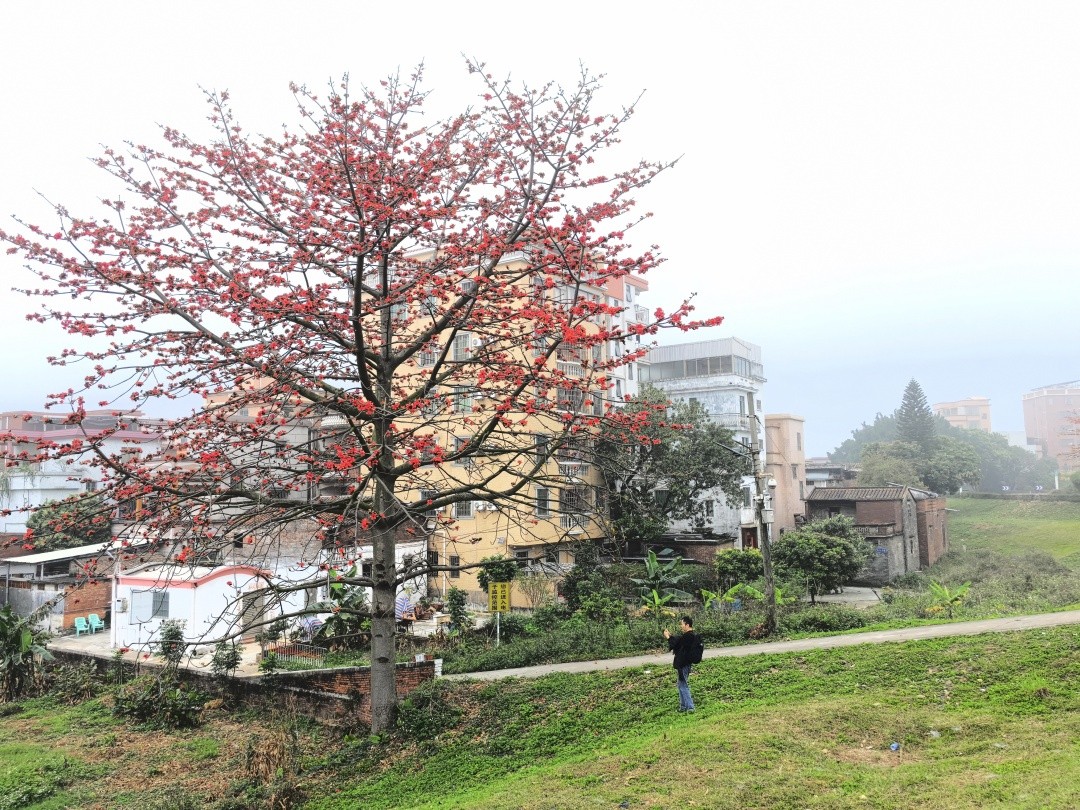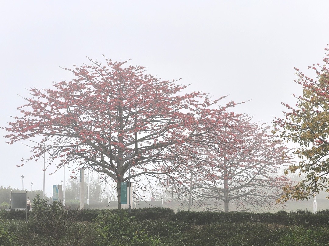 尽管大雾天气给区域交通带来了影响,但正值开花季的木棉花,在雾中形成了如诗如画的美景。美妙的木棉花景,吸引了许多在佛山新城晨练的市民纷纷驻足拍照打卡。