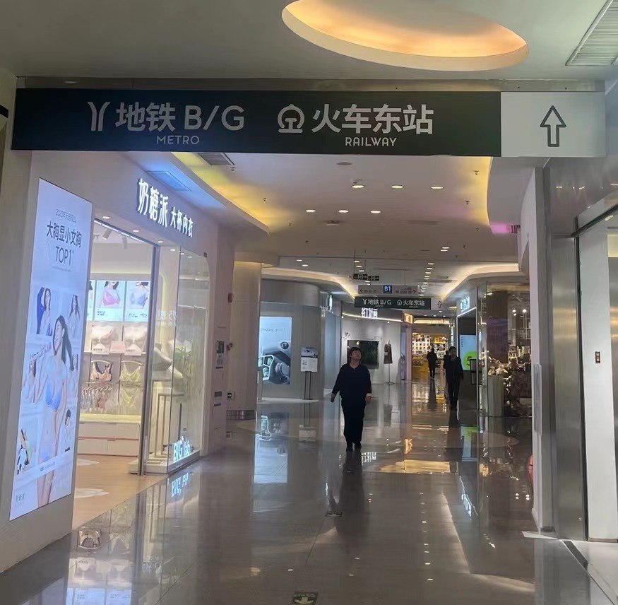 记者从东站广场一侧下电梯,进入商场负一层,每隔20-30米就有一块绿底白字指引标识,写着“地铁B/G口 火车东站”,后分为两个方向,一侧指引标识写着“地铁G口 火车东站”。