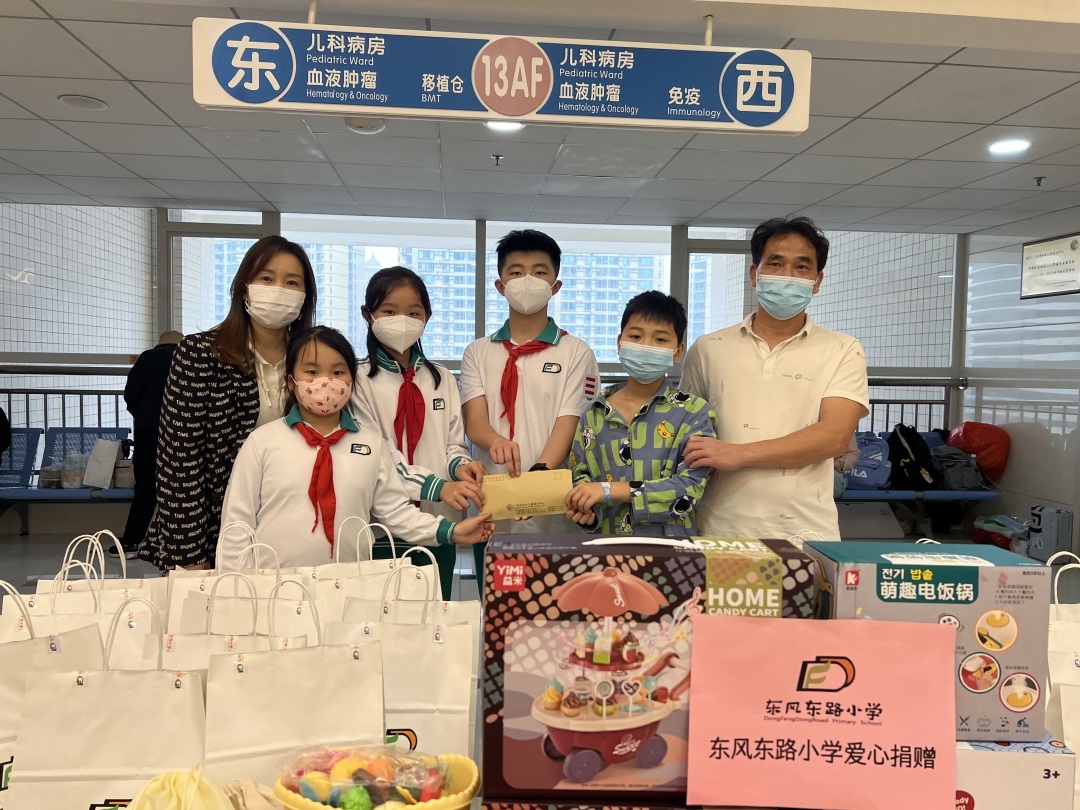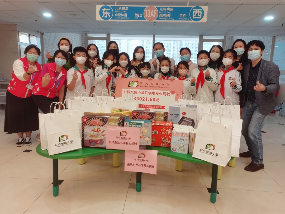 3月15日,东风东路小学师生代表走进广州市妇女儿童医疗中心珠江新城血液肿瘤病区,代表全校3600多名师生为白血病患儿带去问候与资助,亲手将捐款交到白血病患儿手中,同时向病区里的70位小朋友捐赠了玩具、书籍、分药器、输液报警器等关爱物资。