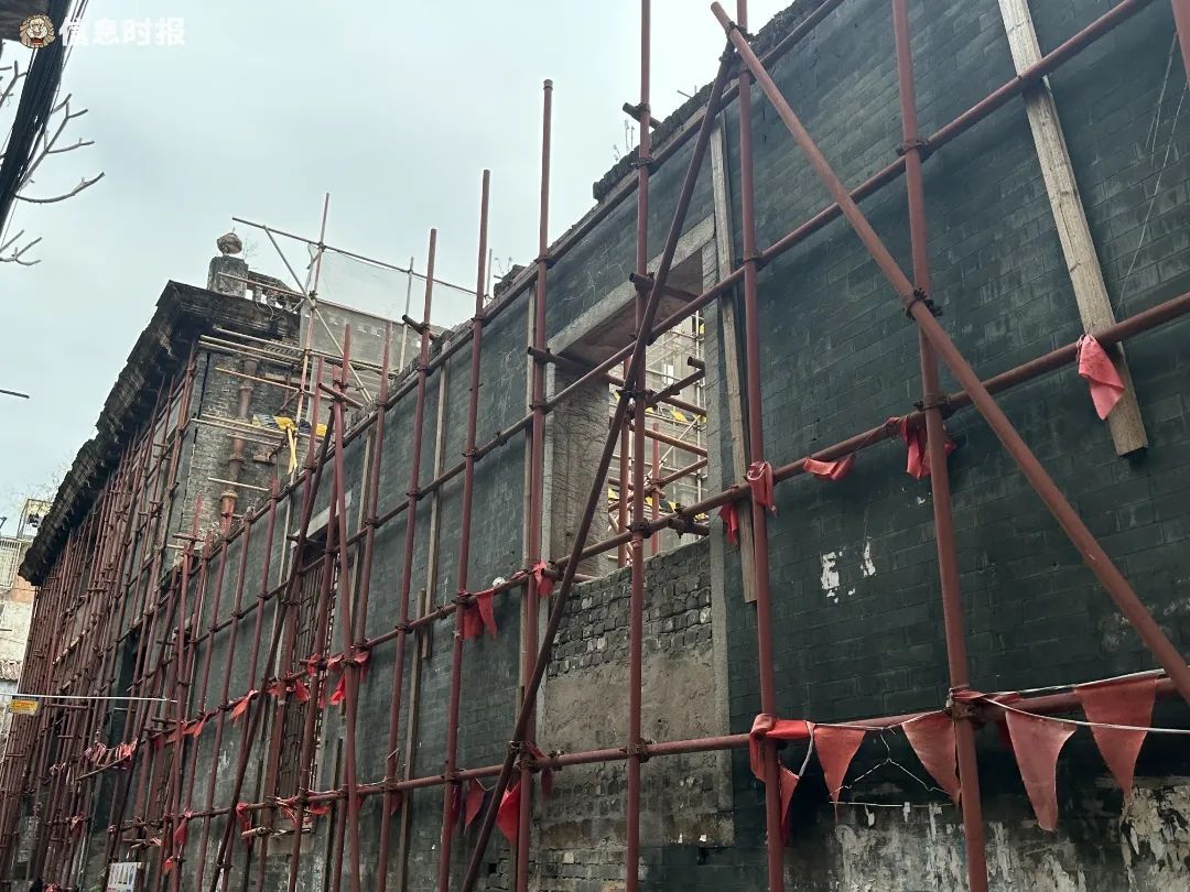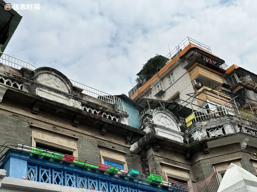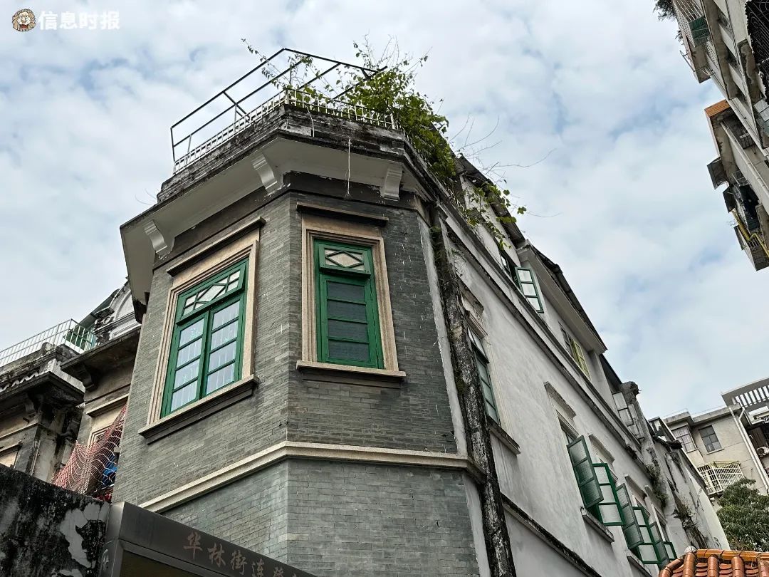 这座位于十六甫东四巷14号的建筑颇具西式风情。抬眼可见,屋顶是欧式山花装饰,房子东西两侧各有多边形仿角亭设计感的空间。