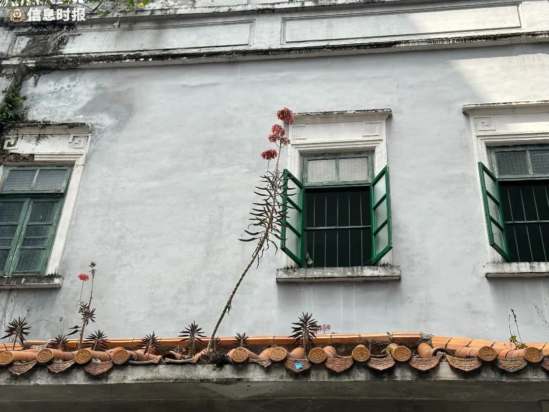 走到院子的正门,围墙上画着骑楼、鸡公榄等西关元素的手绘图案。院门外两块牌匾讲述了这座老宅的“身份”,一块牌匾上标注着这栋宅子于1994年起就被列入广州市文物保护单位;另外一块牌匾上标注着,2012年10月这里被列为“广州市荔湾区登记保护文物单位”。说起这栋建筑,附近街坊都略知一二:“这里就是黄霑故居啦。”