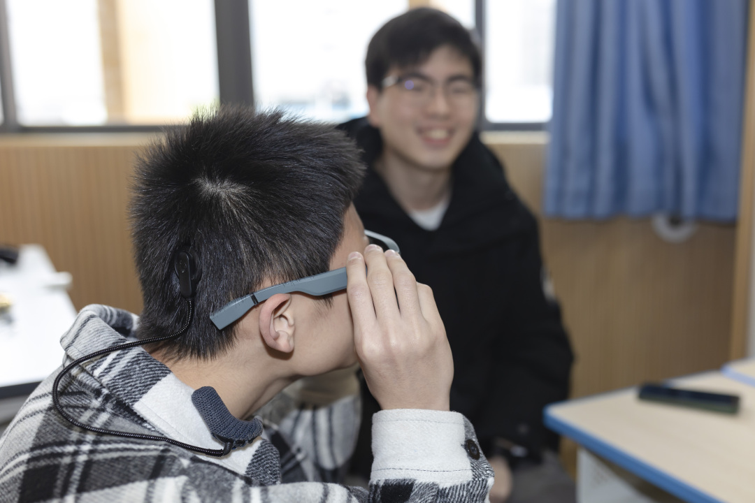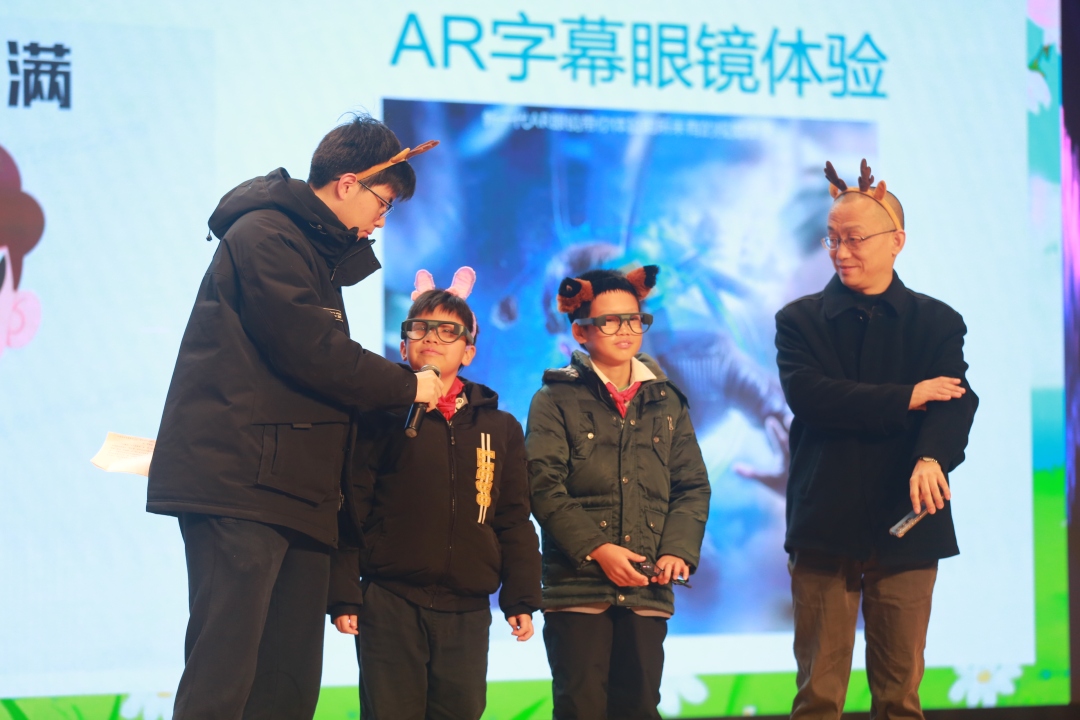 在免费听力检测活动上,普校随读听障学生正在体验AR字幕眼镜
