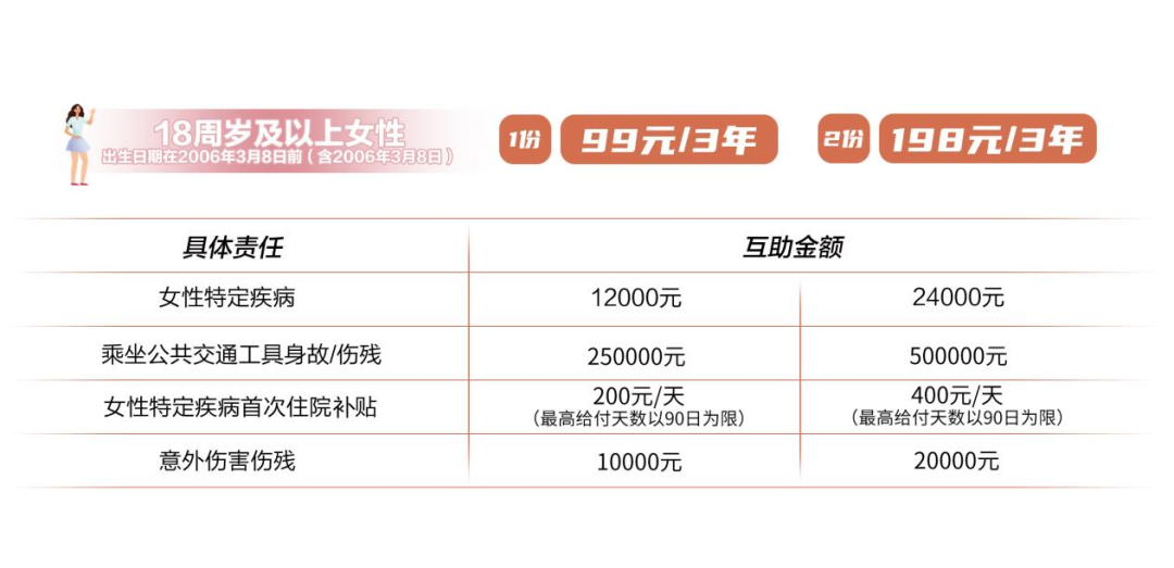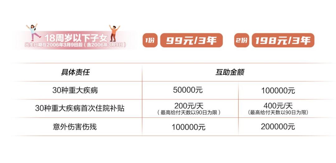 参与金额:99元/人/份/三年;198元/人/两份/三年。每人最多可参与两份,享受帮扶金额倍升。