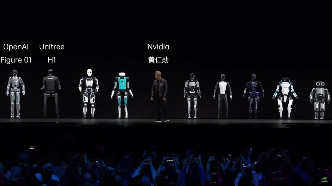 在演讲的过程中,现场共有九位全球顶尖的人形机器人与黄仁勋一同站立在舞台上。其中,OpenAI大模型加持的Figure 01站立在队伍的最左侧,紧邻其右的是来自中国企业的人形机器人——宇树科技的通用人形机器人Unitree H1。