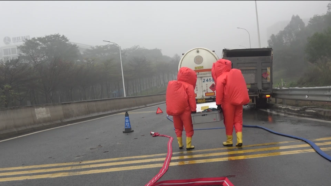 队站到场后主要执行警戒任务,到场前现场工作人员已对现场进行侦检,排除泄露的情况。在南海区交通运输局的协调下,事故车辆公司均已安全转运危险品,现场无人员伤亡。