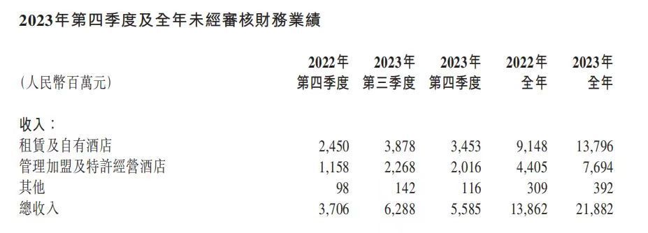3月20日,华住集团发布2023年第四季度及全年财务业绩。财报显示,2023年四季度华住收入为56亿元,同比增加50.7%;酒店营业额为204亿元,同比增加55%。全年来看,华住实现收入219亿元,同比增长57.9%;营业额达到804亿元,同比增长62.1%。