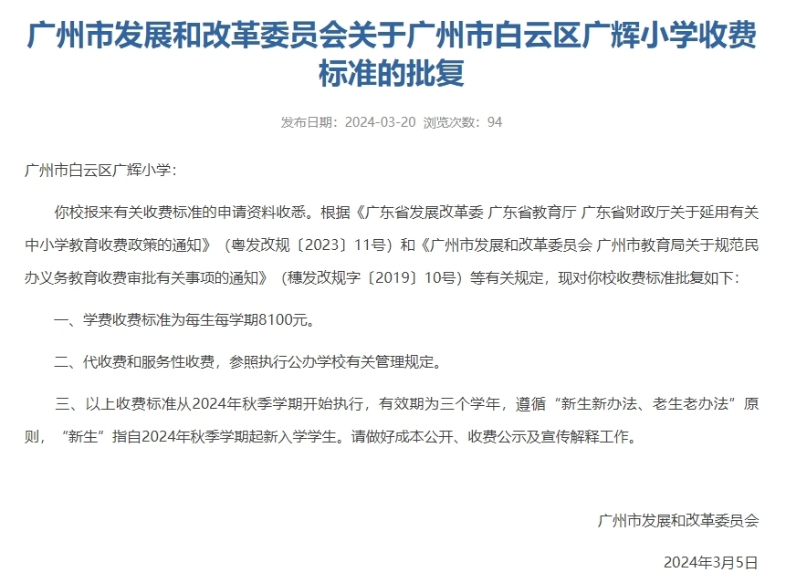 3月20日,广州市发展和改革委员会发布了关于13所民办学校收费标准的批复,包括白云区华赋学校、白云区云雅实验学校、黄埔区华实初级中学等。本次公布的收费标准从2024年秋季学期开始执行,有效期为三个学年,遵循“新生新办法、老生老办法”原则,“新生”指自2024年秋季学期起新入学学生。广州市发展和改革委员会对各校收费标准的批复整理如下。