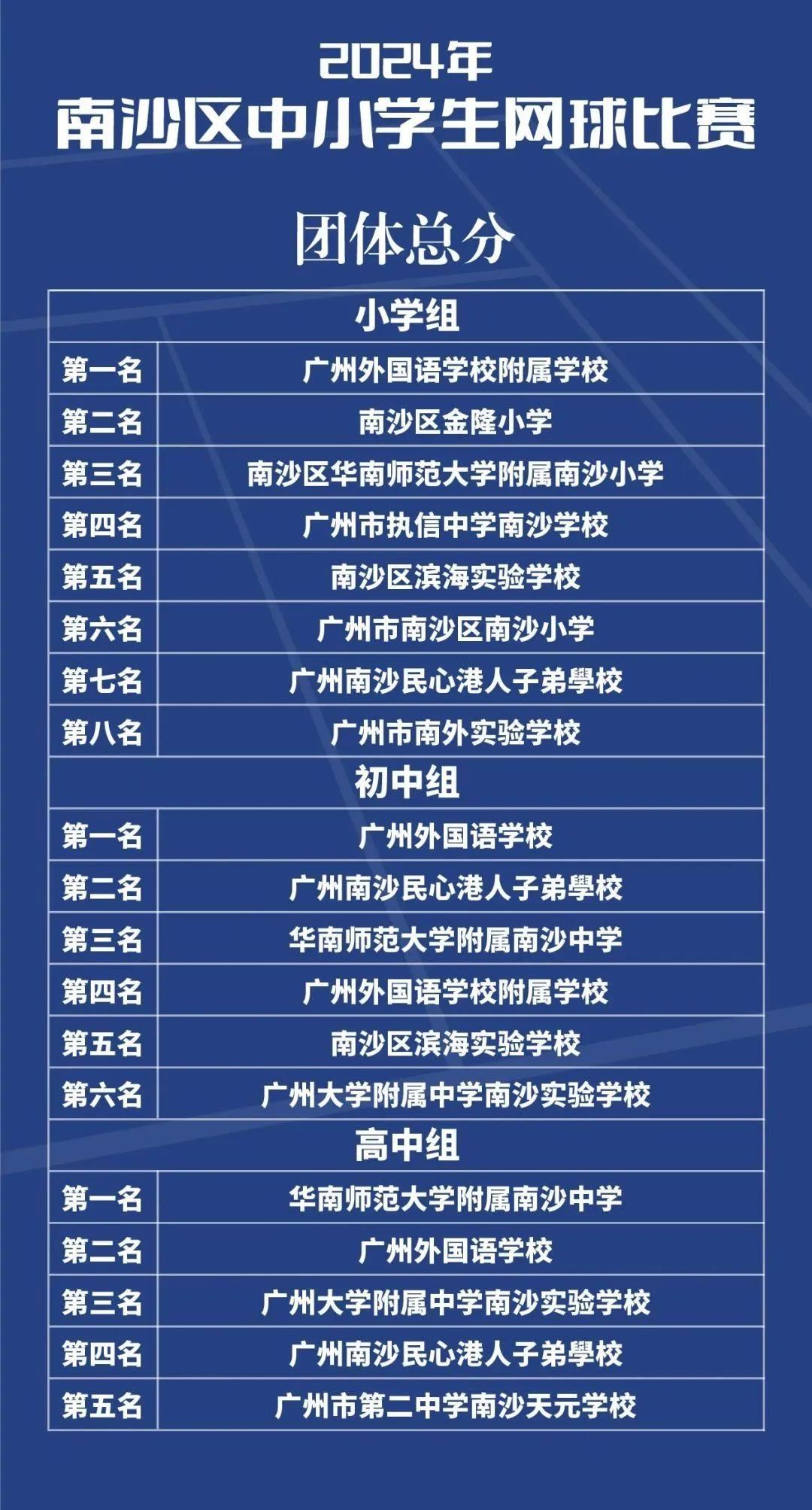 根据各个学校参赛球员的得分总和,还决出了各个组别的团体排名,华南师范大学附属南沙中学、广州外国语学校、广州外国语学校附属学校分别蝉联了高中组、初中组和小学组的团体总分第一名。