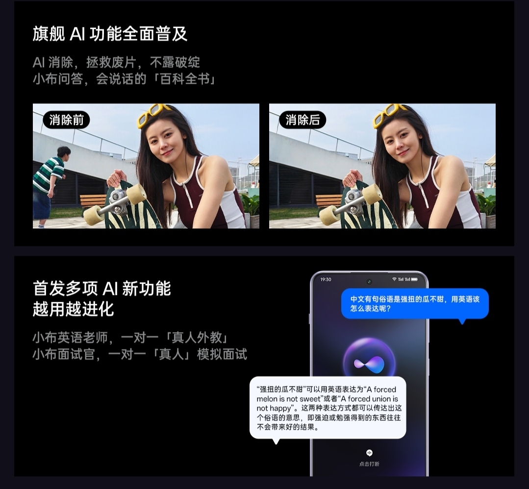 值得关注的是全球首发的多项全新 AI 功能,比如“AI 画师”能用文字一键生成精美图片,“AI 消除”可轻松完成对画面不必要元素的识别、消除以及自然填补,“AI 问答”根据不同生活场景变身智多星,提供各种攻略,“AI 用机助手”则可以完整实现一连串的用机操作,只需口头说出操作需求。由此可见,AI手机的功能已经覆盖到使用的多场景中,此外,还针对年轻人群体首发四大 AI 功能,包括小布英语老师、小布面试官、小布论文助手和小布创意点评 ,通过模拟真人外教练习口语、模拟求职面试、梳理论文框架、生成各平台文案等智慧互动提升学习工作以及生活效率。