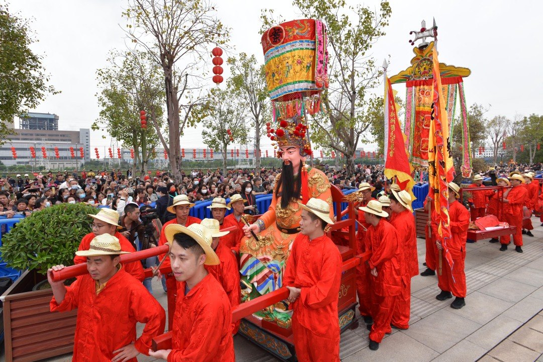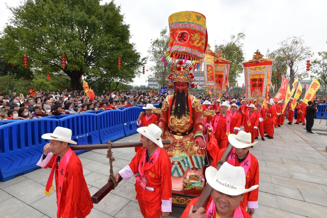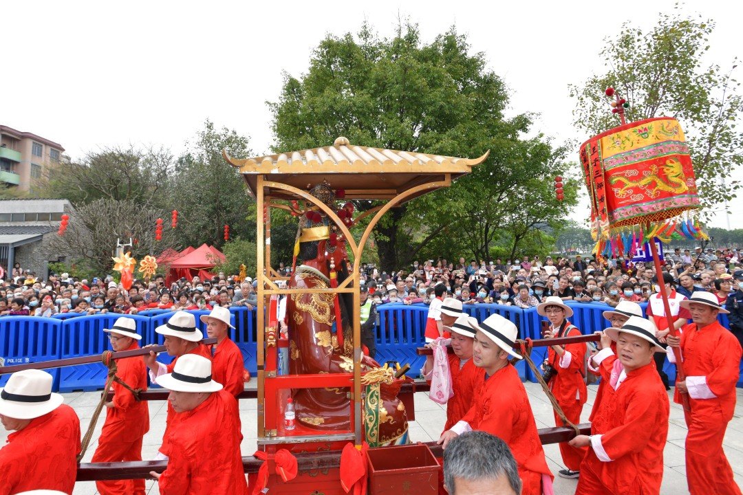 3月22日,广州黄埔“波罗诞”千年庙会迎来正诞日,上演最隆重的“四乡会景,五子朝王”仪式。来自十五乡的乡民们将各自供奉在村里的“南海神”五个儿子的神像,一齐抬到南海神庙,拜见“父王”,为其“贺寿”。