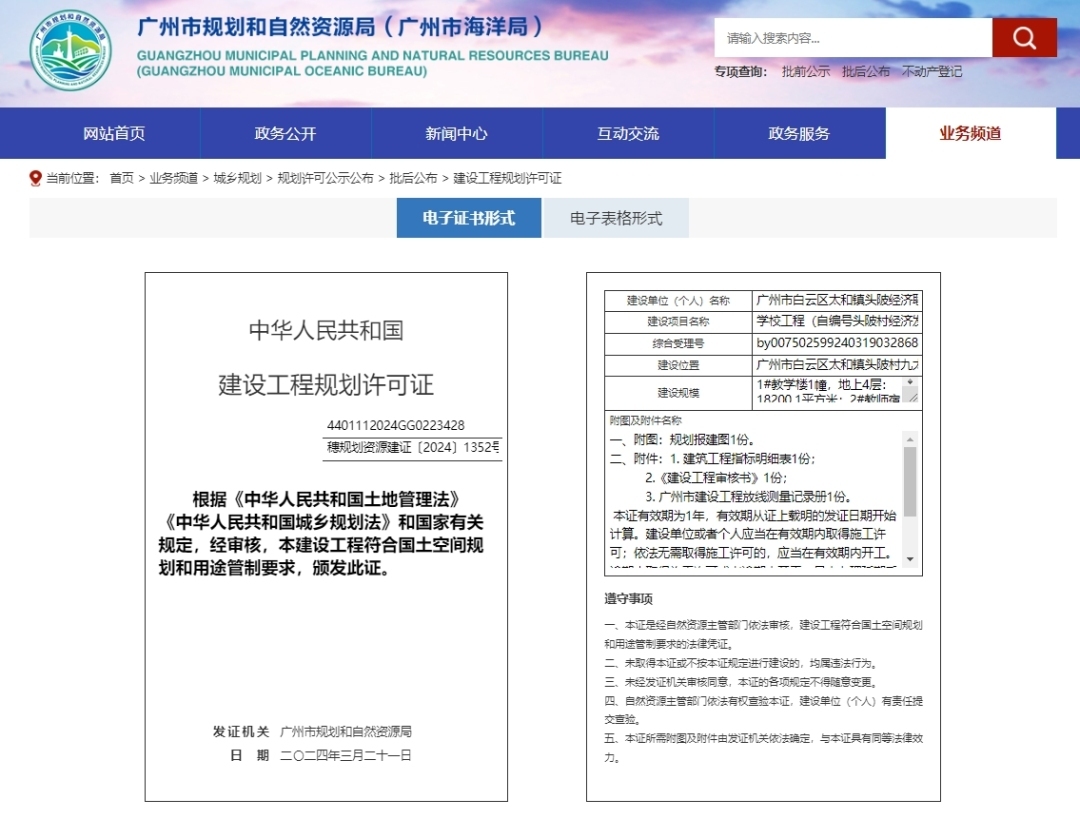 3月21日,广州市规划和自然资源局官网发布了“学校工程(自编号头陂村经济发展留用地项目)”的建设工程规划许可证。许可证显示,该项目建设位置位于广州市白云区太和镇头陂村九太公路南侧。建设规模包括:教学楼1幢,地上4层;教师宿舍及体育馆1幢,地上4层;学生宿舍食堂楼1幢,地上4层等。