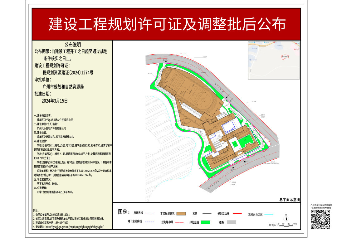 3月21日,广州市规划和自然资源局官网还发布了“黄埔区CPPQ-A5-1地块住宅项目小学”的批后公布图。该项目建设位置位于黄埔区外环路以东、长平路西延线以北,拟建设公建配套小学,独立用地面积28465平方米。