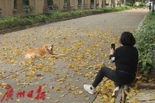 番禺南浦新湄路,有居民带着爱犬在黄叶上拍照。