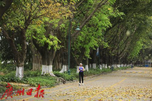 番禺南浦新湄路,居民在落满了黄叶的路面上跑步。