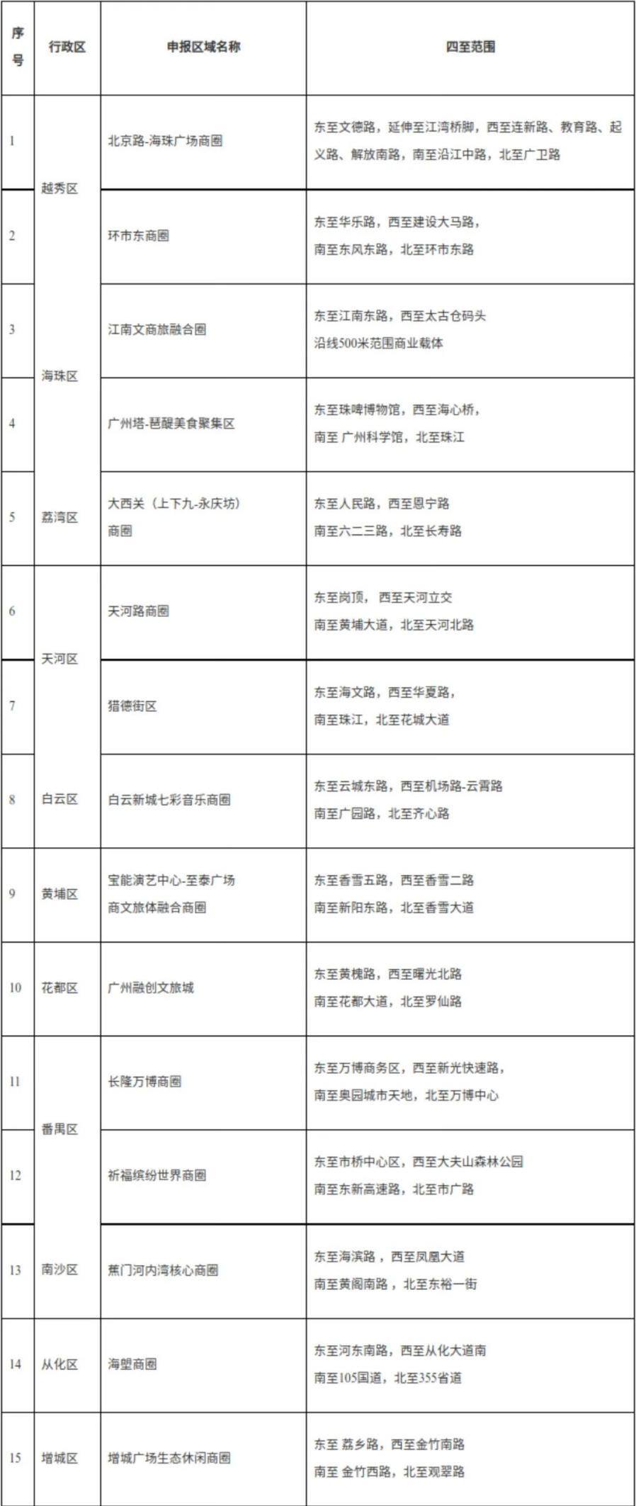 天河路商圈:天河路商圈以天河路为轴线,分布着太古汇、天环广场、万菱汇、正佳广场、天河城等特色商业综合体。领先的业态比例、便捷的交通环境、完善的服务功能,赋予了天河路商圈“华南第一商圈”的底气。2022年,天河路商圈入选首批全国示范智慧商圈。