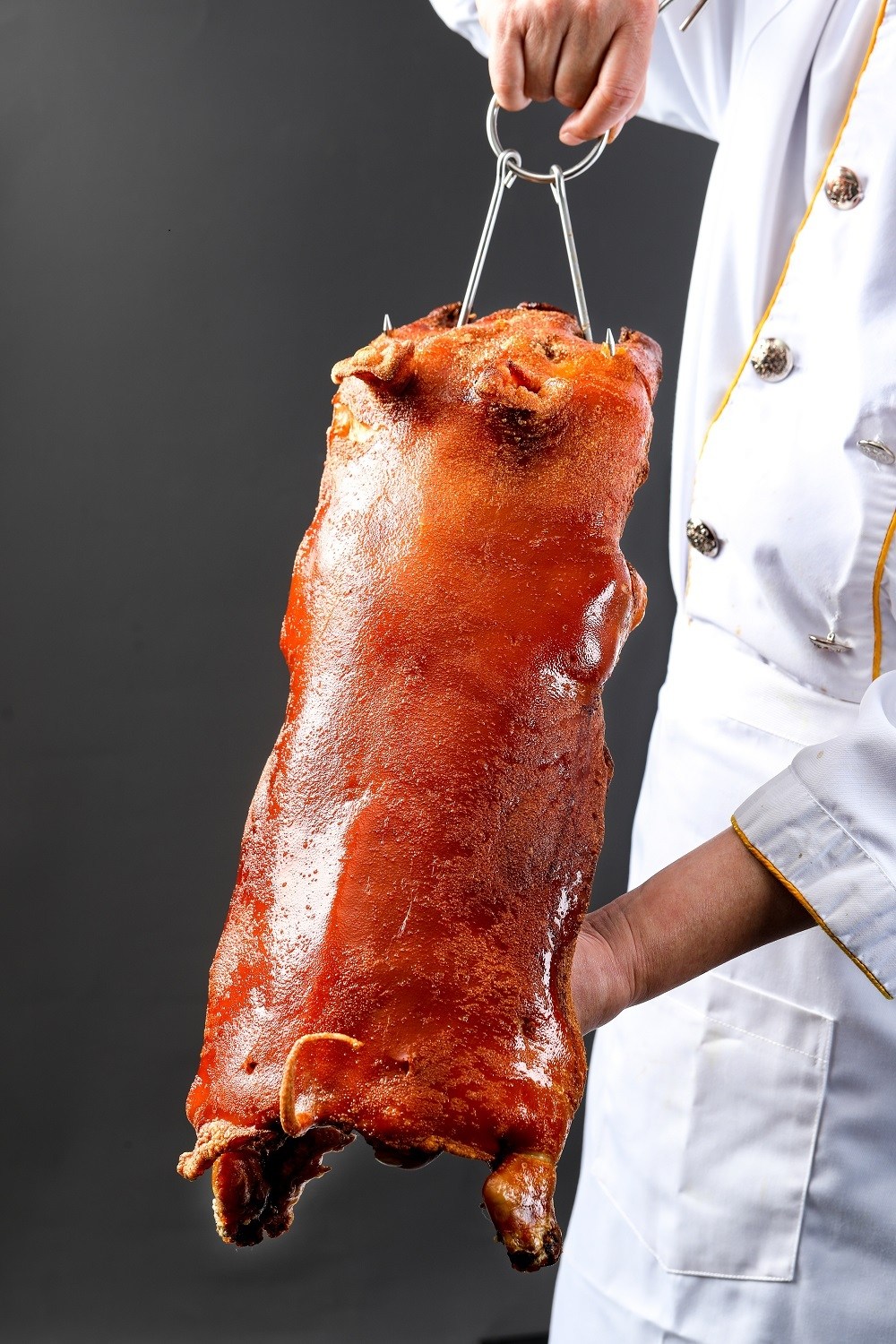 乳猪烤制的过程是对厨师技术、耐心和体力的考验,烤制过程首先需要严格控制火候,用特制的支架把整只乳猪定形置于炭烧烤炉中后,小火慢烤两个半小时左右。慢烤过后是乳猪外皮“松化”的过程,厨师手持乳猪,直接放在猛火上方烤制,这二十分钟内,厨师需要不断转动乳猪,使其全身受热均匀,最后烤好的乳猪色泽金黄,香气四溢。