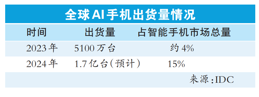 近期,高通推出第三代骁龙8s移动平台,其定位略低于去年10月发布的骁龙8 Gen3,意味着中端手机落地AI功能有了更多的技术支撑。IDC中国高级分析师郭天翔的判断,未来随着芯片算力的继续提升以及目前的旗舰芯片的下放使用,AI手机肯定会更多向中端产品渗透,让更多消费者使用上AI功能。有了中端市场的加速布局,AI手机的出货量有望得到进一步支撑。市场调研机构Canalys预计,2024年全球智能手机出货总量中,预计约5%会搭载端侧AI运算能力。国际数据公司IDC预测,2024年全球新一代AI手机出货量将达1.7亿部,占智能手机整体出货量的15%。到2027年,中国市场AI手机份额占比将超过50%。