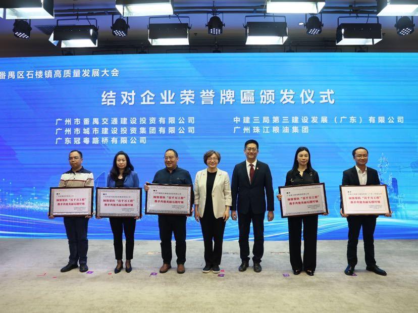 会议通报了“百千万工程”政企结对工作成效,在上级的统筹安排下,番禺交投公司、珠江粮油集团、市城投集团、中建三局、冠粤路桥公司等5家企业与石楼镇结对,捐资助力该镇培育典型镇工程,打造了一批精品项目,为该镇基础设施提标、城镇绿化提升、人居环境提质作出了重要的贡献。会上举行了授牌仪式,向5家企业颁发了荣誉牌匾。