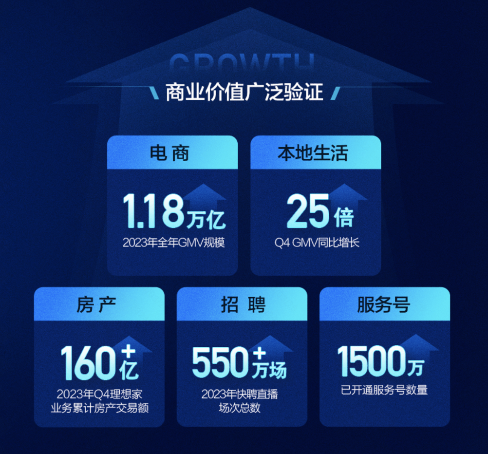 据快手洞察显示,过去一年,三线及以下城市新线市场用户消费能力进一步提升,在快手7亿用户群体中,新线城市用户占比约60%,并且消费潜力巨大,2023年Q4电商用户人均月下单金额超过1000元。其中,电商、本地、小游戏、教育、汽车、招聘、小说、短剧等越来越多的行业进入快手“生意圈”,他们不仅把快手当成是一个广告投放平台,更是把生意经营的全链路都放在快手。2023年Q4教育行业在快手进行全链路经营的客户渗透率提升了54%。