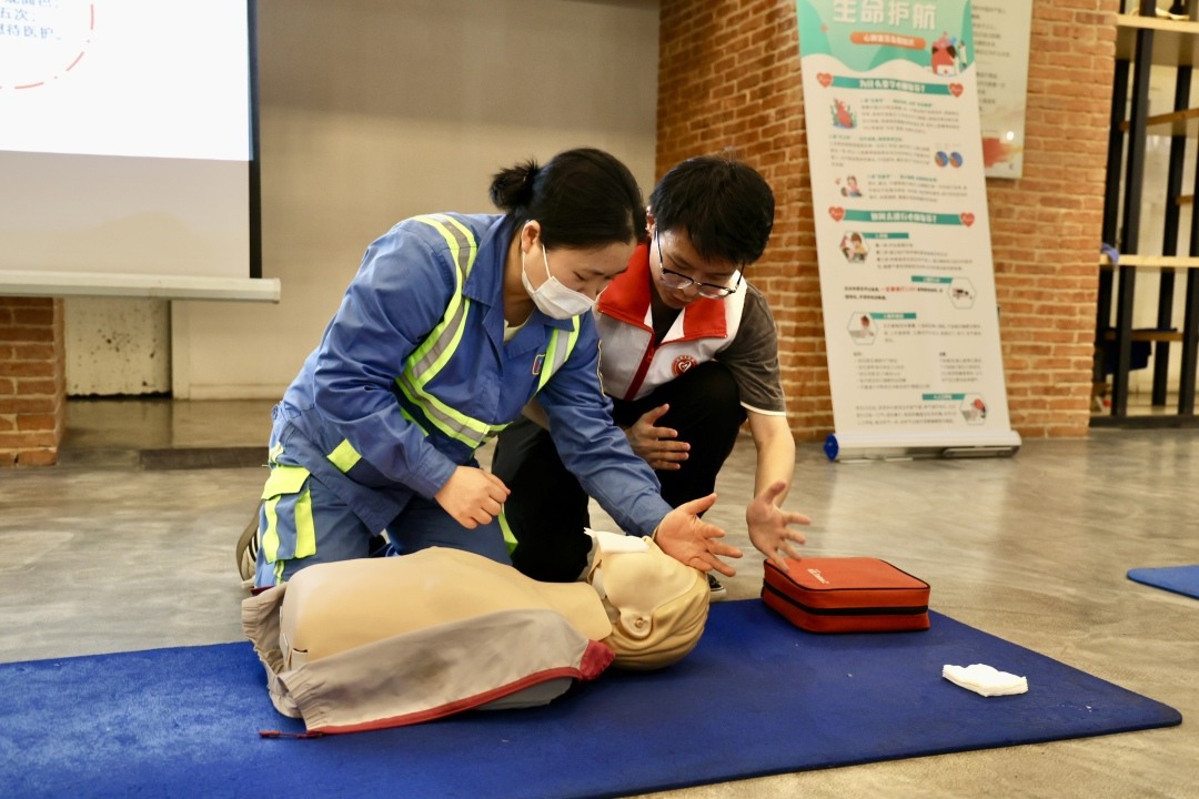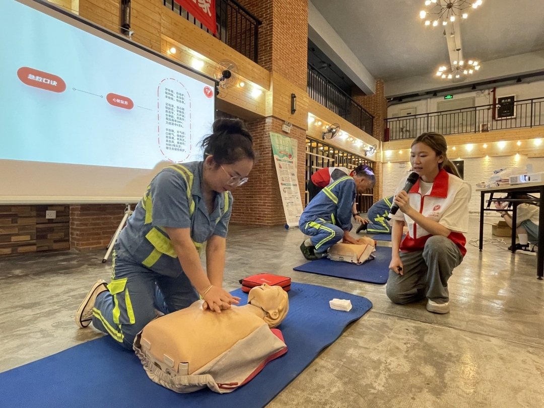 培训由珠江医院团委及临床技能中心专职教师带队,现场教授心肺复苏、AED(自动体外除颤器)使用、海姆立克法等技术,以及外伤、溺水、热射病的紧急处理办法,现场30余位环卫工人在导师指导下进行了实操跟练。