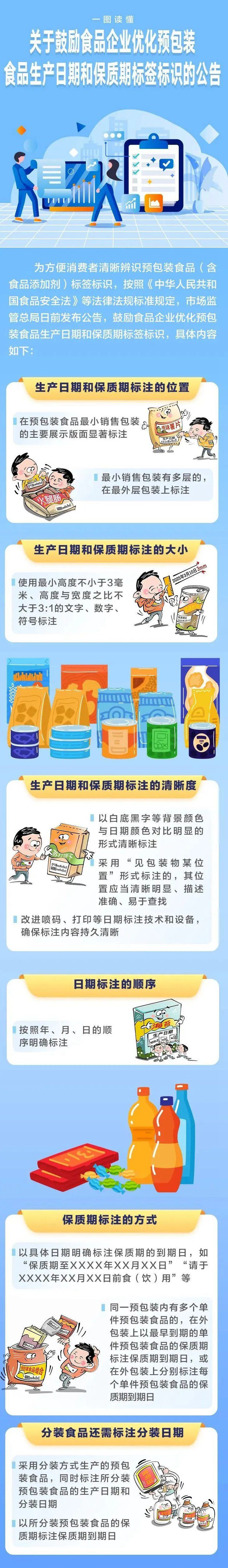 针对消费者反映预包装食品(含食品添加剂)生产日期和保质期“不好找、看不清、不易算”等问题,近日,市场监管总局印发《关于鼓励食品企业优化预包装食品生产日期和保质期标签标识的公告》,推动食品企业积极采取针对性改进措施,方便消费者清晰辨识。