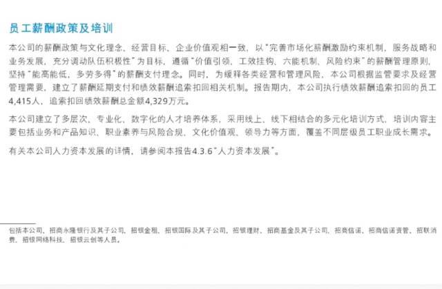 为缓释各类经营和管理风险,招商银行根据监管要求及经营管理需要,建立了薪酬延期支付和绩效薪酬追索扣回相关机制。2023年,招商银行执行绩效薪酬追索扣回的员工4415人,追索扣回绩效薪酬总金额4329万元。
