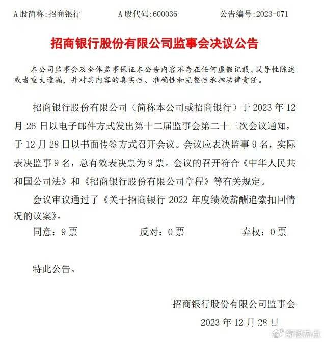 该事件当即引起网友广泛热议。2023年12月28日晚,招商银行发布监事会决议公告称,会议审议通过了《关于招商银行2022年度绩效薪酬追索扣回情况的议案》。