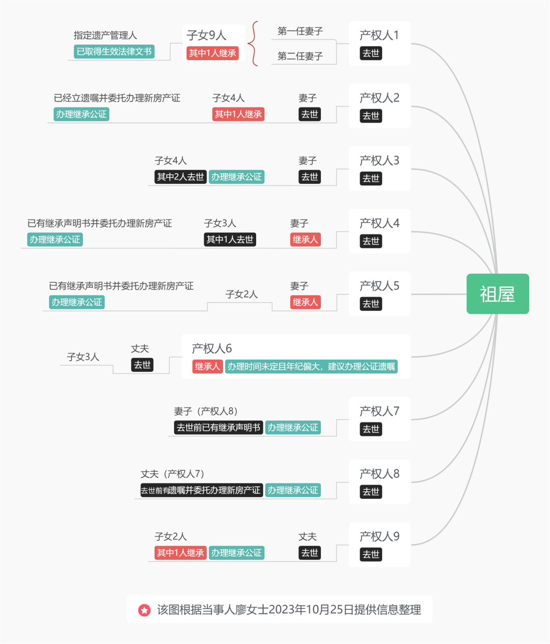 廖女士原系荔湾区文昌北路的老居民,她的祖屋是爷爷遗留并登记在9名子女名下。1994年,廖女士等亲属配合拆迁,搬离祖屋。2018年,房屋征收部门对该地段临迁户签发永迁安置方案,这就意味着廖女士及其家族成员将会获得新安置房。但是,9名产权人中的6人在祖屋拆迁之后的24年间相继去世,涉及34名继承人当中又有7名去世,法律关系变得错综复杂。