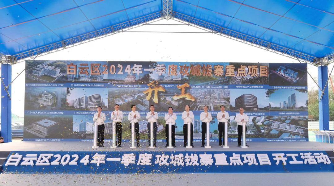 3月28日,广州市白云区2024年一季度攻城拔寨重点项目开工仪式在白云湖数字科技城举行,包括制造业、新一代信息技术产业、健康医药产业、新能源、现代都市农业、民生等领域在内的46个重大项目集中开工,总投资近250亿元,全面吹响今年重点项目建设的冲锋号,为白云区加快建设高质量发展中心城区增添新动能。