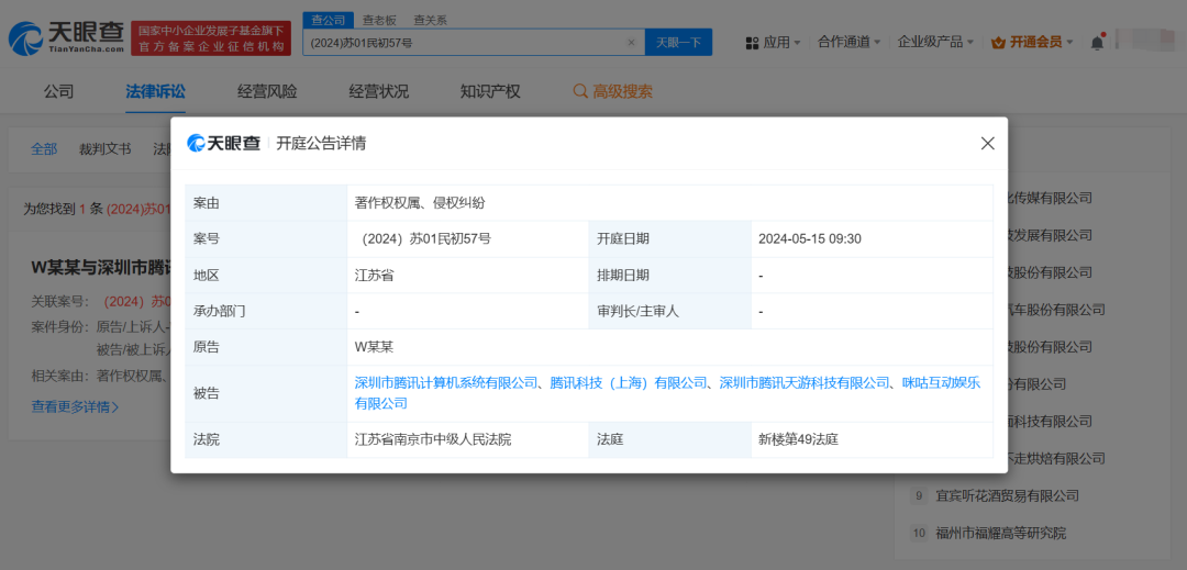 据天眼查App显示,涉事案件案由为著作权权属、侵权纠纷,原告为W某某,被告包括深圳市腾讯计算机系统有限公司、腾讯科技(上海)有限公司、深圳市腾讯天游科技有限公司等,该案将于5月15日在江苏省南京市中级人民法院开庭审理。