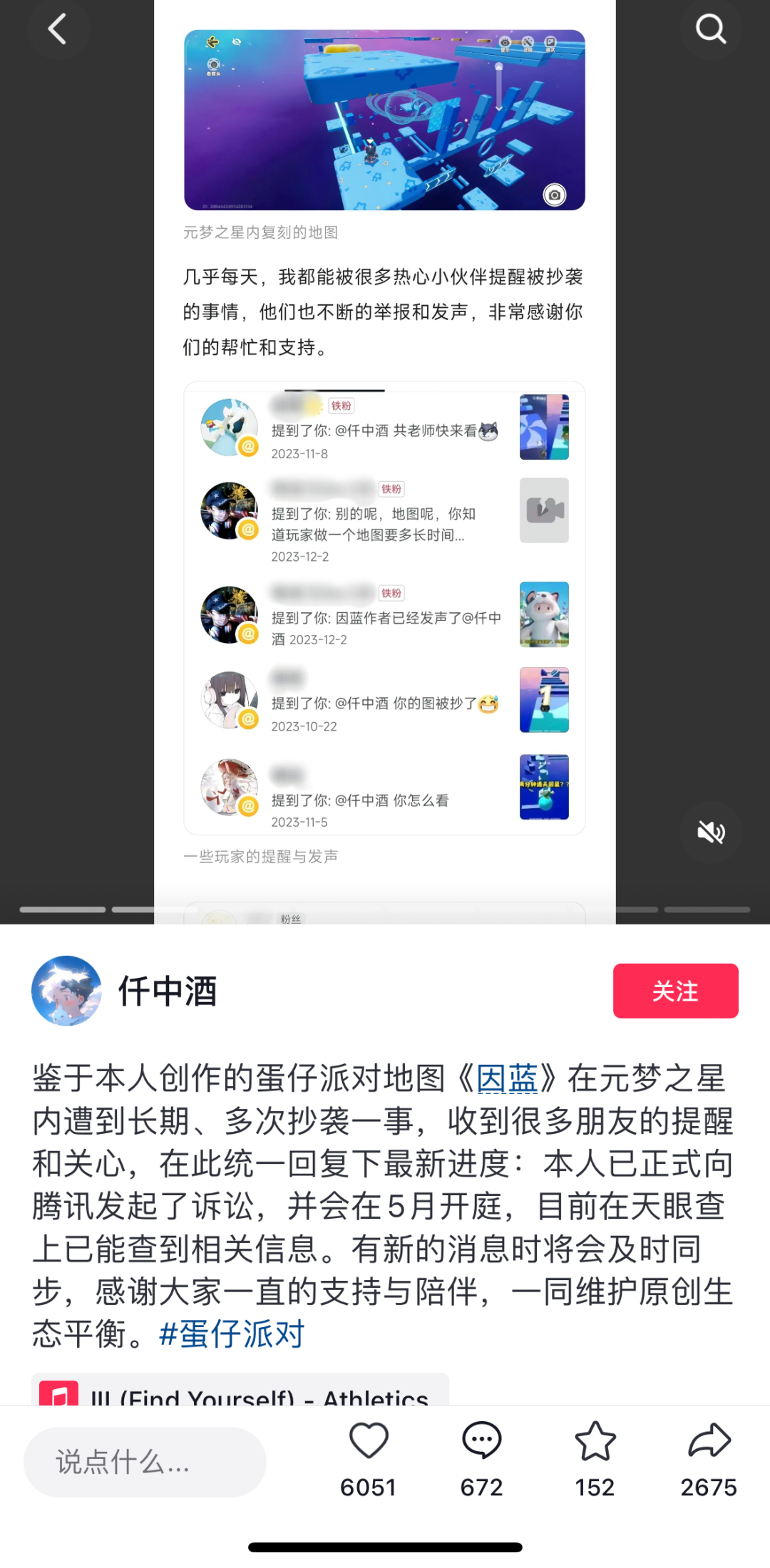 (《蛋仔派对》知名UGC地图创作者“仟中酒”表示已对腾讯发起了诉讼。)