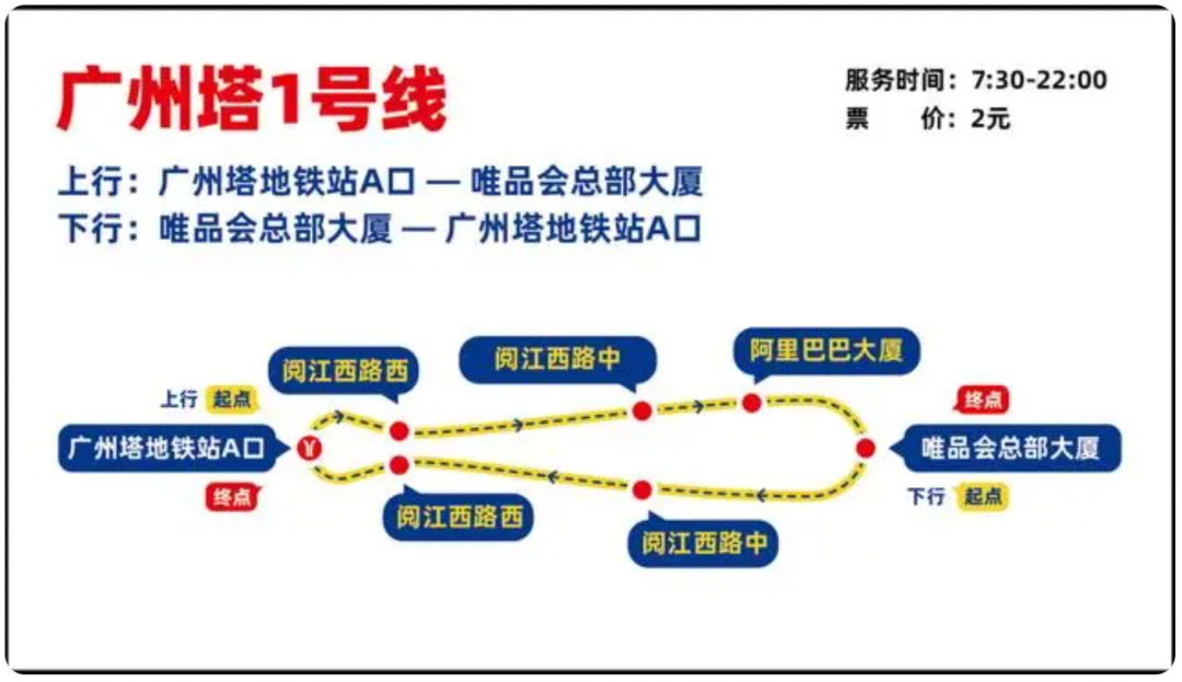其中,广州塔1号线服务时间为7:30-22:00,起止点为广州塔地铁站A口-唯品会总部大厦。市民和游客可以乘坐这条“羊城小巴”到达广州塔,欣赏广州标志性建筑;也可以前往广东琶洲人工智能与数字经济试验区进行商务活动。
