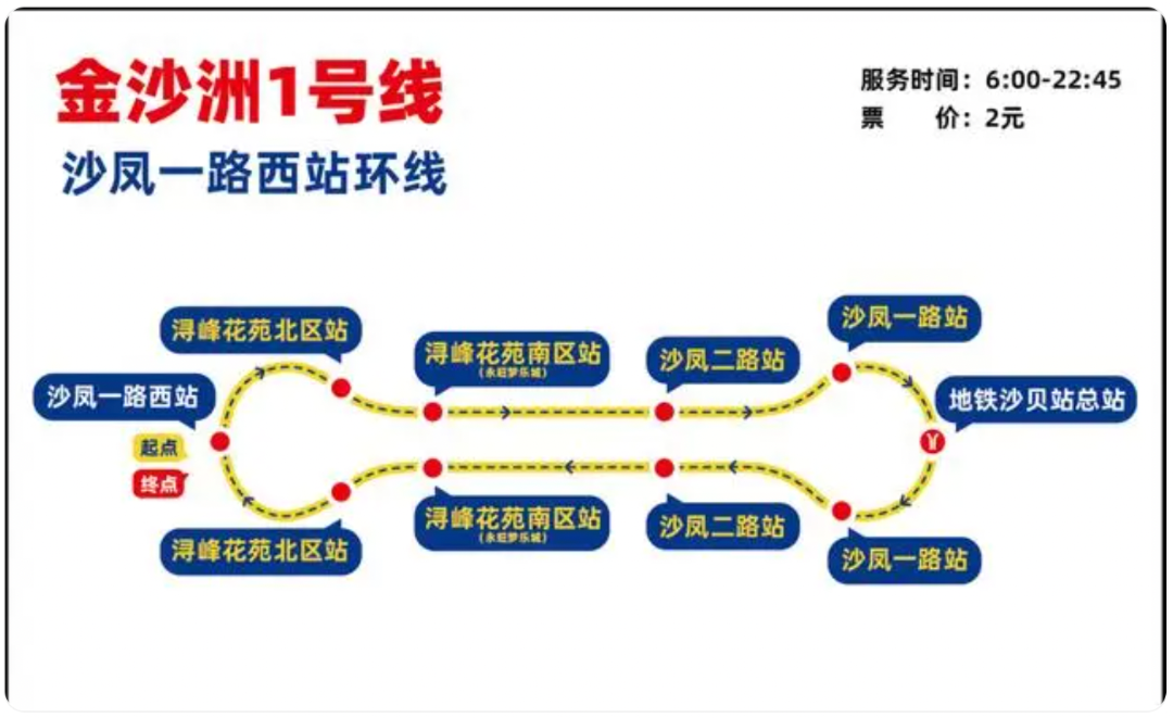 金沙洲1号线是一条环线,覆盖金沙洲周边多个居住区和商业区。线路途经浔峰花苑北区站、浔峰花苑南区站(永旺梦乐城)、地铁沙贝站总站等站点。该线路的开通将为前往附近商业区和地铁站的居民提供便利。